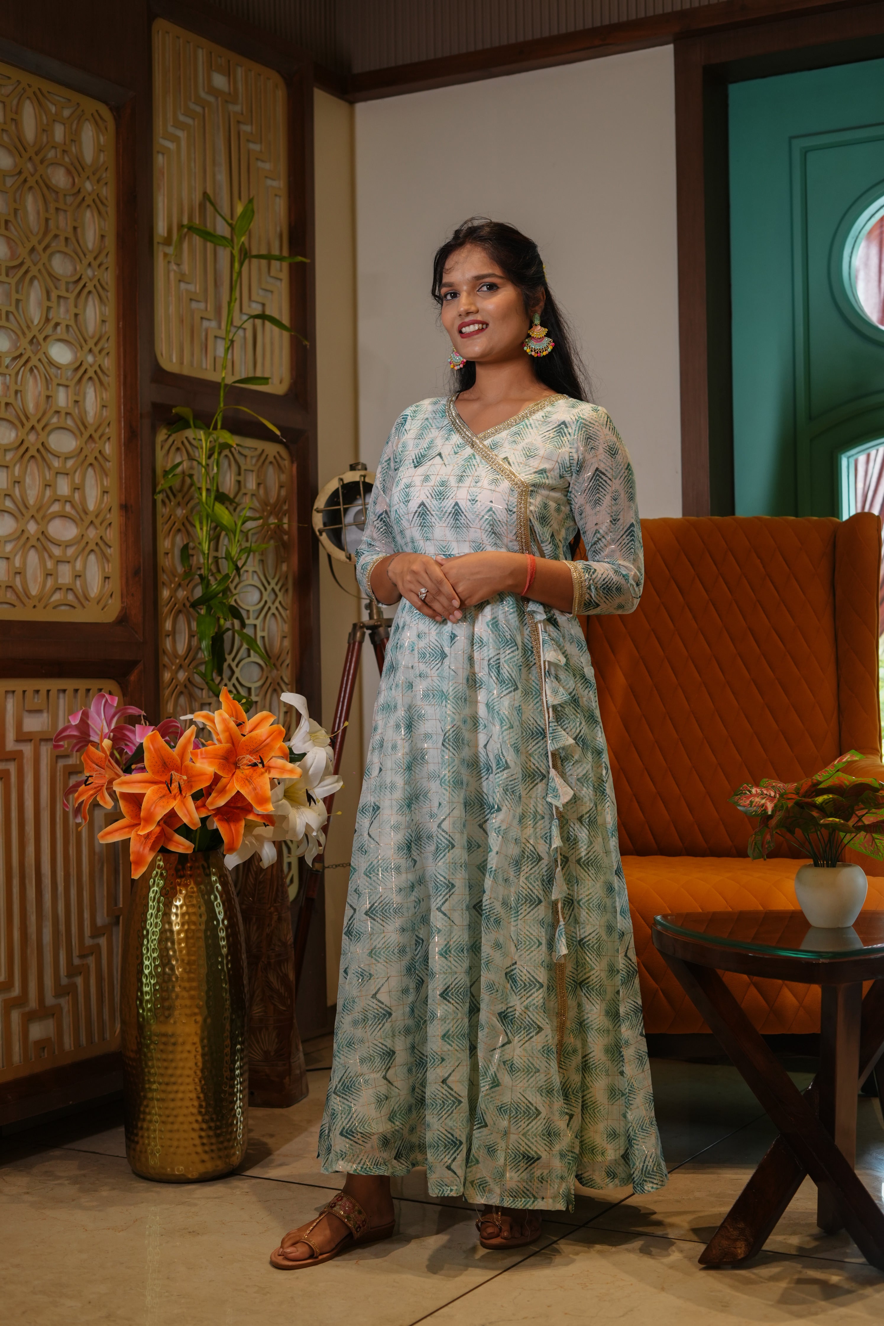 Introducing Paridha's Georgette Angrakha Kurta, a stunning blend of tradition and contemporary style. Crafted from lightweight Georgette, this kurta features a graceful silhouette that flatters all body types. The unique angrakha design, with its elegant draping and intricate detailing, adds a touch of sophistication, making it perfect for festive occasions or casual gatherings. Breathable and comfortable, this kurta ensures you stay stylish without compromising on ease. Paridha’s Georgette Angrakha Kurta is a must-have for any fashion-forward wardrobe. Elevate your ethnic style and make a statement with this exquisite piece today!